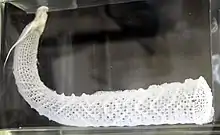 The Venus' flower basket (Euplectella aspergillum) is a glass sponge in the phylum Porifera. It is a marine sponge found in the deep waters of the Pacific ocean, usually at depths below 500 meters. Like other sponges, they feed by filtering sea water to capture plankton and marine snow.[1] Similar to other glass sponges, they build their skeletons out of silica, which forms a unique lattice structure of spicules. The sponges are usually between 10 cm and 30 cm tall, and their bodies act as refuge for their mutualist shrimp partners. This body structure is of great interest in materials science as the optical[2] and mechanical[3] properties are in some ways superior to man-made materials. Little is known regarding their reproduction habits, however fluid dynamics of their body structure likely influence reproduction and it is hypothesized that they may be hermaphroditic.[4]