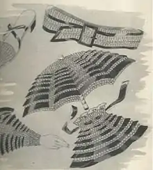 A constant desire to explore and innovate permeated Borea's work. She worked out how to weather-proof corduroy and used it for a raincoat. Another raincoat was made of rubber. She spun hemp with silk for travel suits[24] and introduced in France the two-way-stretch elastic fabrics.[25] An evening coat was made of transparent fabric. An aviator jacket was made of supple leather and a knitted back panel, making it wearable both indoors and outdoors. Shoes sported heels made of rubber. Buttons were made of Brazil nuts. Other elements like fur, raffia, rope, bone, nut, feathers, pine cones and leather also showed up in her designs.[26]