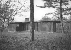 The Vera and Laszlo Tisza House is a historic house at 2 Deer Trail (a cul-de-sac off Gross Hill Road) in the remote northeastern part of Wellfleet, Massachusetts, within the Cape Cod National Seashore. It is one of a number of surviving houses in Wellfleet that combine elements of Modern architecture with traditional Cape Cod architecture. The house was designed by Olav Hammarstrom, a protégé of Eero Saarinen, for Vera and László Tisza. The house is a T-shaped one-story structure with a central breezeway that provides views of the surrounding woodlands to much of the house. The main block, which is divided by the breezeway, measures 41 by 25 feet, with a 31 by 14 foot section added perpendicular to its north end. A flat roof, covered with rolled asphalt, extends for two feet beyond the edges of the house, and has exposed rafters that are visible both inside and outside the house. There is a recessed porch on the south side of the main block.[2]