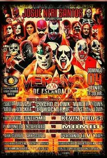 The top storyline in AAA leading up to Verano de Escándalo began in August 2016 at Triplemanía XXIV, during the main event match between the tecnico Psycho Clown and rudo Pagano, Dr. Wagner Jr. came to the ring, looking like he was going to save Psycho Clown from outside interference. Moments later he hit Psycho Clown below the belt to help Pagano out. In the end Psycho Clown overcame the odds and pinned Pagano to win the match. Afterwards Dr. Wagner Jr. challenged Psycho Clown to put his mask on the line at the following year's Triplemanía XXV show, a challenge that was immediately accepted.[5][6] At the next AAA super show, Héroes Inmortales X, Dr. Wagner Jr. defeated Psycho Clown and Pagano in a three-way match when Psycho Clown's partners in Los Psycho Circus (Monster Clown and Murder Clown) turned on him and sided with Dr. Wagner Jr. instead.[7] The two rivals would later officially sign the contract for the Lucha de Apuestas, or "bet match".[8] During an AAA show in mid December Psycho Clown's sister Goya Kong, would also turn on her brother, as she hit him with a steel chair as AAA continued to stack to the odds against Psycho Clown towards the Triplemanía XXV.[9]