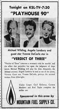 "Verdict of Three" was an American television play broadcast on April 24, 1958, as part of the second season of the CBS television series Playhouse 90. James P. Cavanagh wrote the teleplay based on the 1940 novel, Verdict of Twelve by Raymond Postgate. Buzz Kulik directed and Martin Manulis produced. Michael Wilding, Angela Lansbury, and Yvonne De Carlo starred.[1]