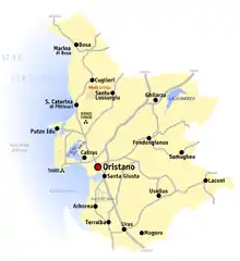 The province of Oristano where Vernaccia di Oristano may have originated. Also shown on the map is the location of the ruins of the Phoenician settlement of Tharros on the coast of the Gulf of Oristano.