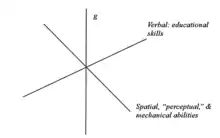 Vernon puts emphasis on the g factor in all the mental abilities. He extracted the g factor from an ability test, then found that those remaining content could be divided into two separate parts. He named those two orthogonal group factors as verbal-educational factor (v:ed) and perceptual-mechanical skill factor (k:m).