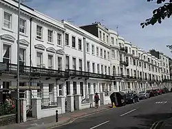 The houses at the south end of the terrace (1–6) date from between 1856 and 1857, and those at numbers 7–16 are contemporary.[11] Numbers 1, 6 and 7–16 rise to four storeys; the other houses have only three. All are stucco-clad and have cast iron balconies at first-floor level.[21][22] The end house, number 1, has a two-window range and an entrance in Windlesham Avenue (with a three-storey canted bay window next to it. Numbers 2–6 each have three windows to each storey, but other differences include the detailing of the entrance porches: there are various combinations of single or double entablatures, pilasters, architraves and rustication, and the placement of the porches also varies. Continuous rustication spans all six ground-floor walls, though. Some windows are set in moulded architraves with pediments of various designs. A cornice runs above the top floor, but is not continuous and changes in style from flat to modillion.[21] At numbers 7–16, standard features include straight-headed entrance porches, ground-floor rustication, three windows to each storey, many set in architraves with decorative moulding, and a continuous cornice and parapet. Number 8 has extra balconies at second- and third-floor level.[22]