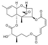 Verrucarin A is a chemical compound that belongs in the class of trichothecenes, a group of sesquiterpene toxins produced by several fungi, namely from the Fusarium species, that are responsible for infecting food grains. Within the skeleton of the basic trichothecene structure, the olefin and epoxide are crucial for toxicity; ester functionalities and hydroxyl groups often contribute to the toxicity, thereby rendering verrucarin A as one of the most lethal examples. The mechanism of action for this class of toxins mainly inhibits protein biosynthesis by preventing peptidyl transferase activity. Although initially thought to be potentially useful as anticancer therapeutics, numerous examples of trichothecene derivatives were shown to be too toxic for clinical use.