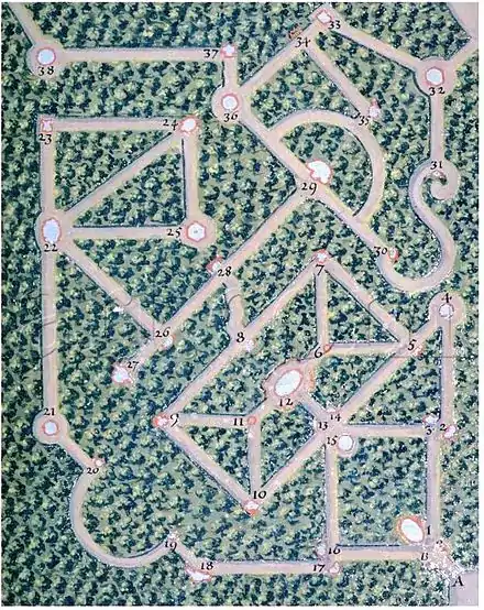 The layout of the maze was unusual, as there was no central goal, and, despite the five-metre-high (16 ft) hedges, allowed glimpses ahead.[6] Jean-Aymar Piganiol de La Force in his Nouvelle description du château et parc de Versailles et de Marly (1702) describes the labyrinth as a "network of allées bordered with palisades where it is easy to get lost." He continues: "At every turn you see a fountain decorated with delicate rocaille, and representing very simply a fable, the subject of which is indicated by a four-line inscription in gold letters on a bronze plate."[7]