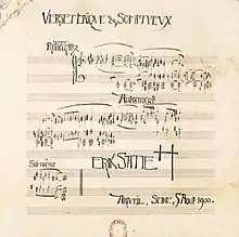 Formally dated "Arcueil, Seine, 5 August 1900", the Verset laïque et somptueux was the only piece in the old Rose + Croix style (1891-1895) that Satie composed at his new home in Arcueil, 10 kilometers (6.2 miles) south of Paris, where he had moved in October 1898.[6] This period saw him reexamining his creative past (the Gnossiennes), either out of nostalgia for his early Montmartre days or searching for clues to a new stylistic beginning. The minute-long Verset has the characteristics of the "religious mystic" music: slow reflective tempo, expansive chordal writing, harmonic modality. It is built of seven phrases of unequal length, unified by transpositions of the opening three chords. With its pseudo-Gothic calligraphy the look of Satie's autograph score is also period correct, and for the last time he signed his name with the emblem of his defunct church, the Metropolitan Church of Art of Jesus the Conductor - a Greek cross and Latin cross linked together.[7] The irony of this personal adieu surfaces mostly in the minimal text and hints at deeper things. "Secular and Sumptuous Verse" may be an incongruous title here but is an apt reference to Satie's career in 1900, when he was miserable as a jobbing cabaret songwriter - quite the comedown from his self-styled role as leader (and sole member) of his own religious sect. The work's three playing directions, Réfléchir, Autrement and Soi-même, can roughly be translated together as "Think differently of yourself". And in the penultimate phrase (after the Autrement) the music gets in the final dig by hinting at the Airs à faire fuir from the Pièces froides (1897) - "Tunes to Make You Run Away".