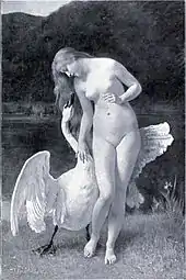 The cover art to Vespertine [...] explores the theme of personal identity through visual means: hence Björk is featured in black and white, shading her eyes, lips slightly parted in an unmistakably erotic pose. For the first time in this context, however, she does not meet the viewer's gaze directly. Instead, the superimposed image of a swan provides a protective shield between Björk and the viewer. Both this photograph and Björk's subsequent appearances at promotional events dressed as a swan metonymically evokes not only the mythic figure of Leda, but more particularly the familiar legend in which she exchanges her husband, the Spartan king Tyndareus, for the God Zeus when he approaches her in disguised form. As in other visual representations of this myth, the entwined bodies of Leda and the swan permit a representation of erotic intimacy that would prove unacceptable if realised in a more literal fashion.[43]