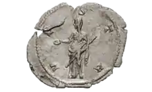 The temple of Vesta held not only the ignes aeternum ("sacred fire"), but the Palladium of Pallas Athena and the di Penates as well. Both of these items are said to have been brought into Italy by Aeneas.[51] The Palladium of Athena was, in the words of Livy: "fatale pignus imperii Romani" ("[a] pledge of destiny for the Roman empire").[52] Such was the Palladium's importance, that when the Gauls sacked Rome in 390 BC, the Vestals first buried the Palladium before removing themselves to the safety of nearby Caere.[48] Such objects were kept in the penus Vestae (i.e. the sacred repository of the temple of Vesta).[53]