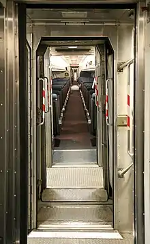 A vestibuled train is a passenger train whose cars have enclosed vestibules at their ends, in contrast to the open platforms on early cars. Typically, a vestibule has doorways on either side to allow passenger entry and exit at stations, a door into the body of the car, and, at the car end, a doorway to allow access to the next car through a flexible gangway connection.