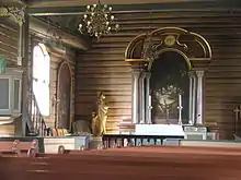 In 1766, the log construction was covered over with wooden paneling that were painted white and a black trim pattern on the corners give the illusion of masonry. In 1777, there was a major renovation of the interior where some of the partition between the nave and choir was removed and the choir ceiling was redone as a barrel vault, which was painted with the sky and clouds. In 1830, a sacristy was built to the north of the choir. Around 1900, the interior was changed according to the taste of the time: the vaulted ceiling was painted white and the paneled walls were painted green, the altarpiece was replaced with a cross, and much of the old furniture was replaced. In the 1930s, the interior was somewhat restored under the direction of Wilhelm Swensen. During this project, the wall paneling was removed and the historic rococo interior was brought back.[4]