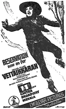 Vettaikkaran (transl. Hunter) is a 1964 Indian Tamil-language action drama film directed by M. A. Thirumugam and produced by Sandow M. M. A. Chinnappa Thevar. The film stars M. G. Ramachandran and Savitri Ganesh, with M. R. Radha, M. N. Nambiar, S. A. Ashokan, Thai Nagesh, M. V. Rajamma, Manorama and Baby Shakila in supporting roles. It revolves around an estate hunter whose penchant for hunting displeases his family, and a plunderer who lusts for his wealth.
