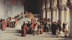 Vettor Pisani (1324 – 13 August 1380) was a Venetian admiral. He was in command of the Venetian fleet in 1378 during the war against the Genoese, whom he defeated off Capo d'Anzio; subsequently he recaptured Cattaro, Sebenico and Arbe, which had been seized by the Hungarians, the allies of the Genoese. But the Genoese fleet completely defeated Pisani at Pola in May 1379, and on his return to Venice he was thrown into prison. The Genoese then pressed home their victory, and besieged and captured Chioggia, whereby Venice itself was in danger. The people thereupon demanded the liberation of Pisani, in whose skill they had the fullest confidence.[1]
