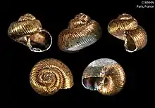(Original description) The small shell is turbiniform, thin and umbilicated. It shows radiating ribs crossing spiral threads . The peristome is interrupted by the body whorl . The outer lip in the completely adult is reflected and somewhat thickened. The aperture is unarmed. [2]