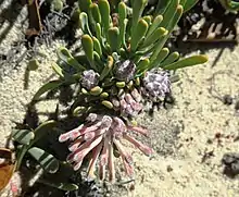 Fire destroys the plant but the seeds survive. Two months after flowering, the fruit falls off and ants disperse the seeds. They store the seeds in their nests. The plant is unisexual. Pollination takes place through the action of insects. The plant grows in dry fynbos in sandstone soil at altitudes of 300-1800 m.