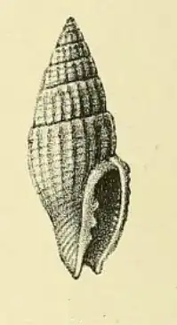 The species is distinguished by its conspicuously shouldered whorls. The fusiform shell contains eight whorls, of which two in the protoconch. The shell is uniformly closely longitudinally oblique-ribbed, these ribs being crossed by many regular spiral sulci, which give them a beaded appearance. The aperture is oblong. The outer lip is crenulated. The columella contains three plaits. The short siphonal canal is slightly recurved. The surface is pure white, with the exception of a dorsal ochreous band on the lower portion of the body whorl. [2]