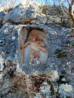 There are four figures; three soldiers and a woman. They are dated to Roman Empire era.[1] Each figure is about 1 metre (3 ft 3 in) tall and had been carved on the northern slope of a hill about 3 metres (9.8 ft) high with respect to ground.