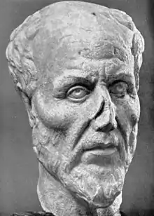 Parmenides (fl. late sixth or early fifth century BC), in his poem On Nature, gives an account of a revelation on two ways of inquiry. "The way of conviction" explores Being, true reality ("what-is"), which is "What is ungenerated and deathless,/whole and uniform, and still and perfect."[12] "The way of opinion" is the world of appearances, in which one's sensory faculties lead to conceptions which are false and deceitful. His distinction between unchanging Truth and shifting opinion is reflected in Plato's allegory of the Cave. Together with the Biblical story of Moses's ascent of Mount Sinai, it is used by Gregory of Nyssa and Pseudo-Dionysius the Areopagite to give a Christian account of the ascent of the soul toward God.[13] Cook notes that Parmenides poem is a religious account of a mystical journey, akin to the mystery cults,[14] giving a philosophical form to a religious outlook.[15] Cook further notes that the philosopher's task is to "attempt through 'negative' thinking to tear themselves loose from all that frustrates their pursuit of wisdom."[15]