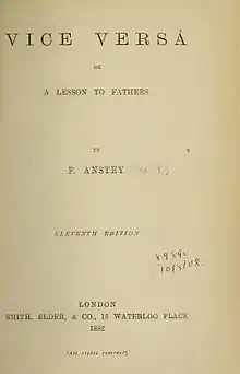 Vice Versa: A Lesson to Fathers is a comic novel by Thomas Anstey Guthrie, writing under the pseudonym "F. Anstey", first published in 1882. The title originates from the Latin phrase "vice versa", meaning "the other way around".