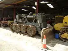 In common with tanks of this period, but in contrast to crawler tractors, the suspension had considerable articulation and permitted high speeds. The Vigor was capable of nearly 10 mph, while the comparable Caterpillar D8 could only reach 5 mph.[1] The four roadwheels were linked as two bogies on each side. Pairs of bogies on opposite sides were linked by an articulated beam with a centre tilt pivot. This suspension required a flexible track, developed by Vickers, with rubber sealing washers between the moving parts.[1] Wear to the rubber in service could make the track floppy, a drawback to the design. Together with the sophisticated suspension articulation, if not well-maintained, the Vigor was prone to throwing tracks when run at speed.