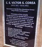 Sri Lankan author Kumari Jayawardena, writing about the Coreas observed: 'Unconnected to the liquor trade but making their money on plantation ventures was the Corea Family of Chilaw, an influential goyigama group with a history going back to Portuguese rule when they were warriors to Sinhala kings. During Dutch and British rule, members of the family were officials serving the state in various ways and rewarded with titles. Some members of the family took to the legal and medical professions, most notably the sons of Charles Edward Corea (a solicitor), who were active in local politics and in the Chilaw Association which campaigned against British land policies – especially the Waste Lands Ordinance, and for political reforms. The most active of Corea's sons was C.E.(Charles Edgar) who spoke up for peasant rights and was militant in his stand against the government. He was President of the Ceylon National Congress in 1924. C.E. Corea's brother, Alfred Ernest, was a doctor and the youngest Victor Corea was a lawyer who achieved fame for leading a campaign (and going to jail) in 1922 to protest the Poll Tax on all males; he was the first President of the Ceylon Labour Union led by A.E.Goonesinha and was active in the Ceylon Labour Party. While being professionals and political activists, the Coreas were also important landowners.[2]