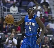 On October 25, 2015, the Magic exercised their fourth-year team option on Oladipo's rookie scale contract, extending the contract through the 2016–17 season.[35] Five days later, he recorded his second career triple-double with 21 points, 13 rebounds and 10 assists in a double-overtime loss to the Oklahoma City Thunder. He also hit a buzzer-beating three-pointer to send the game into double overtime.[36] Oladipo averaged just 12.8 points per game over his first 12 games of the season. Head coach Scott Skiles moved Oladipo to a bench role for the Magic's November 25 game against the New York Knicks.[37] Oladipo continued coming off the bench following this performance, averaging 17.0 points, 5.4 rebounds, 4.5 assists, 1.0 steals and 1.4 blocks over his first eight games off the bench.[38] On January 4, he started for the Magic for the first time since November 23. In 34 minutes of action, he recorded a team-high 18 points, 7 rebounds, 5 assists and 2 steals in a loss to the Detroit Pistons.[39] On March 18, he scored a career-high 45 points in a 109–103 loss to the Cleveland Cavaliers, becoming the ninth player in franchise history to score 40 points in a game and the first Magic player to do so since Arron Afflalo in December 2013.[40] Oladipo missed the final three games of the season with a concussion.[41]