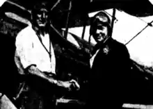 A civic reception was also held in Dingo on 23 November 1921.[36] Roffey flew from "Melbadale" to Dingo with his father as a passenger to attend the reception.[36] When Roffey attempted to land his plane in the main street of Dingo, he collided with a parked car and two gate posts as he attempted to navigate around the obstacles in the street.[36][37] Despite this, his fellow members from the Dingo Cricket Club hoisted him up on their shoulders and took him to the Dingo Hall where the civic reception was being held.[36]