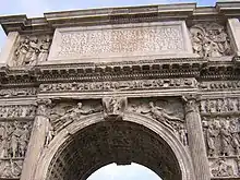 Winged figures, very often in pairs, representing victory and referred to as winged victories, are common in Roman official iconography, typically hovering high in a composition, and often filling spaces in spandrels or other gaps in architecture.[9] These represent the "spirit of victory" rather than a full-blown deity. Pairs of winged victories continued to appear after the Christianization of the Roman Empire and gradually evolved into depictions of Christian angels.[10] A pair, facing inwards, fitted very conveniently into the spandrels of arches, and have been very common in Triumphal arches and similar designs where a circular element is framed by a rectangle.