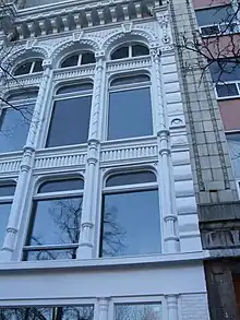 - On the top floor, semi-circular arched windows with highly decorated voussoirs and large keystones;