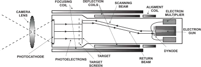 An image orthicon consists of three parts: a photocathode with an image store (target), a scanner that reads this image (an electron gun), and a multistage electron multiplier.[98]