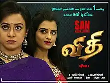 Vidhi (Tamil: விதி) (transl. Fate) is a 2017 Indian Tamil-language family soap opera starring Sreeja, Rashmi Jayraj, Vibhu Raman, Ravi Raj, Surjith Ansary and Anu.[1] It replaced Nijangal and was broadcast on Sun TV on Monday to Saturday from 6 March 2017 to 20 January 2018 at 1:00PM (IST) for 301 episodes. It was produced by San Media Ltd and directed by Stalin Iniya. The title track was composed by Dhina and sung by Karthik and Rita with lyrics by Vairamuthu.[2][3] It ended on 20 January 2018.