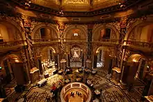 Emperor Franz Joseph I of Austria-Hungary opened the facility around 1891 at the same time as the Natural History Museum, Vienna which has a similar design and is directly across Maria-Theresien-Platz.[2] The two buildings were constructed between 1871 and 1891 according to plans by Gottfried Semper and Baron Karl von Hasenauer. The emperor commissioned the two Ringstraße museums to create a suitable home for the Habsburgs' formidable art collection and to make it accessible to the general public. The buildings are rectangular, with symmetrical Renaissance Revival façades of sandstone lined with large arched windows on the main levels and topped with an octagonal dome 60 metres (200 ft) high. The interiors of the museums are lavishly decorated with marble, stucco ornamentation, gold-leaf, and murals. The grand stairway features paintings by Gustav Klimt, Ernst Klimt, Franz Matsch, Hans Makart and Mihály Munkácsy.[3]