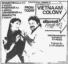 Vietnam Colony is a 1994 Indian Tamil-language comedy film directed and co-written by Santhana Bharathi. It is a remake of the 1992 Malayalam film of the same name which itself was based on the 1983 Scottish film Local Hero. The film stars Prabhu, Goundamani and Vineetha. It revolves around two men trying to persuade some colony residents to relocate to another location for the sake of a corporate project, but the residents, and some goons, oppose them. Vietnam Colony was released on 15 July 1994.