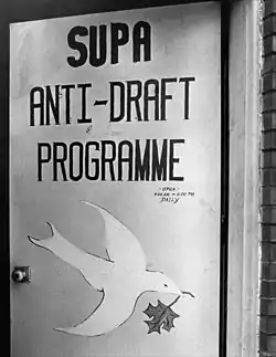 American draft evaders were at first assisted by the Student Union for Peace Action, a campus-based Canadian anti-war group with connections to Students for a Democratic Society.[6][7] By late 1967, draft evaders were being assisted primarily by several locally based anti-draft groups (over twenty of them), such as the Vancouver Committee to Aid American War Objectors[8][9] and the Toronto Anti-Draft Programme.[10][11] As a counselor for the Programme, Mark Satin wrote the Manual for Draft-Age Immigrants to Canada in 1968.[12][13] It sold nearly 100,000 copies overall.[14][15]