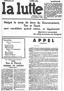 In 1933, several factional representatives, including Tạ Thu Thâu, Nguyễn Văn Tạo of the PCI [later to be labour minister in Hanoi][9] and the anarchist Trinh Hung Ngau, regrouped around charismatic figure of Nguyễn An Ninh, and took the initiative of legally opposing the colonial regime in the Saigon municipal elections of April–May 1933. They put forward a common "Workers's List" and briefly published a newspaper (in French to get around the political restrictions on Vietnamese), La Lutte (The Struggle) to rally support for it. In spite of the restricted franchise, two of this Struggle group were elected (although denied their seats), the independent (later Trotskyist) Tran Van Thach and Nguyễn Văn Tạo.