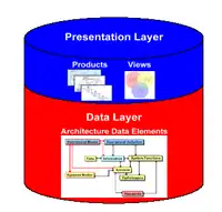 At the data layer are the architecture data elements and their defining attributes and relationships. At the presentation layer are the products and views that support a visual means to communicate and understand the purpose of the architecture, what it describes, and the various architectural analyses performed. Products provide a way for visualizing architecture data as graphical, tabular, or textual representations. Views provide the ability to visualize architecture data that stem across products, logically organizing the data for a specific or holistic perspective of the architecture.