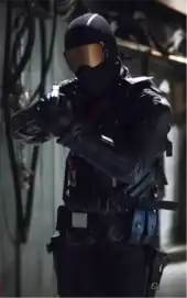 - An original incarnation of Vigilante named Vincent Sobel appears in Arrow, portrayed by Clayton Chitty in the fifth season and by Johann Urb in the sixth season while Mick Wingert provides his disguised voice.[15] This version was a former member of the Central City Police Department who worked undercover alongside Dinah Drake, with whom he shared a secret relationship. After they were both captured by a group of criminals, Sobel and Drake were exposed to dark matter from Harrison Wells' particle accelerator, which turned Sobel into a metahuman with the ability to self-regenerate, though he was presumed dead. Resurfacing four years later as the "Vigilante", he targets and kills criminals before coming into conflict with Oliver Queen and his allies. After targeting a councilwoman due to an anti-vigilante bill, he is thwarted by Drake, who discovers his identity. Sobel attempts to reconcile his relationship with her despite their differing stances on fighting crime, though without success. Due to his love for Drake, he became a double agent within Cayden James's criminal cabal to inform Drake and Queen of their activities. When his partners find out about his treachery however, Sobel is killed by Black Siren.