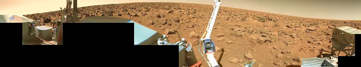 The Viking 2 mission was part of the American Viking program to Mars, and consisted of an orbiter and a lander essentially identical to that of the Viking 1 mission.[1] Viking 2 was operational on Mars for 1281 sols (1,316 days; 3 years, 221 days). The Viking 2 lander operated on the surface for 1,316 days, or 1281 sols, and was turned off on April 12, 1980, when its batteries failed. The orbiter worked until July 25, 1978,[1] returning almost 16,000 images in 706 orbits around Mars.[5]