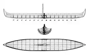 The first longships can trace their origin back to between 500 and 300 BC, when the Danish Hjortspring boat was built.[17] It was fastened with cord, not nailed, and paddled, not rowed. It had rounded cross sections and although 20 m (65 feet) long was only 2 m (6 feet) wide. The rounded sections gave maximum displacement for the lowest wetted surface area, similar to a modern narrow rowing skiff, so were very fast but had little carrying capacity. The shape suggests mainly river use. Unlike later boats, it had a low bow and stern. A distinctive feature is the two-prong cutaway bow section.