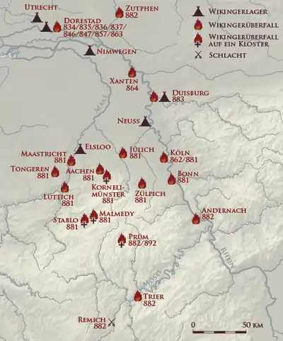 In late 881, Vikings, who had overwintered in Flanders, set off on a military expedition to neighbouring lands. They raided numerous villages in the area of the Meuse and razed the towns of Liège, Maastricht and Tongeren to the ground.[10]