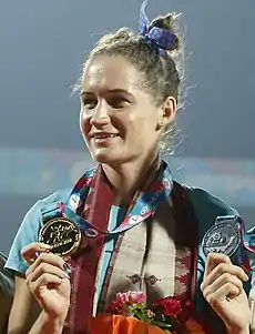 Viktoriya Viktorovna Zyabkina (Cyrillic: Виктория Викторовна Зябкина; born 4 September 1992) is a Kazakhstani sprinter who mostly competes in the 100 m and 200 m distances. She represented her country at the 2012 and 2016 Summer Olympics, but failed to reach the finals. She won a silver and a bronze medal in the 4 × 100 m relay at the 2014 and 2018 Asian Games, respectively. Between 2013 and 2017 she won five gold and one silver medals at the Asian Championships, five of them in individual events.[2]