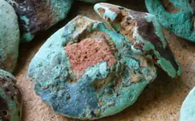 Excavations have found that malachite (Cu2(CO3)(OH)2), a type of copper carbonate, is plentiful in the Vilabouly complex. Chalcocite (Cu2S), a secondary copper sulfide, is also found in many places in the complex, and it is often found nearby or mixed with pieces of malachite.[1]