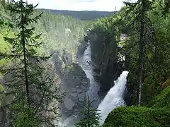 Vildmarksvägen passes near Gaustafallet, another waterfall which also drains into a gorge. This waterfall was one of the locations for a film by Astrid Lindgren, titled Ronia the Robber's Daughter.[6] Although the area is similar in size to Västra Götaland County, which has a population of 1,590,000, the population in the wilderness area is only 22,000, resulting in a population density of less than 1 person per km2.[7]