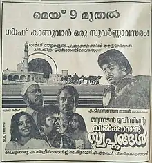 Vilkkanundu Swapnangal (transl. Dreams for Sale) is a 1980 Malayalam-language drama film, directed by Azad, written by M.T. Vasudevan Nair and produced by V. B. K Menon. The film stars Sukumaran, Srividya, Sudheer, Bahadoor and Sreenivasan. The film also features Mammootty, in his first credited role.[1] The film explores the middle east boom that happened in Kerala in the eighties, when people started to go to the middle east in search of jobs with a higher pay. The film explores this through Rajagopal (Sukumaran) who goes to the middle east as an illegal immigrant to support his family.[2]