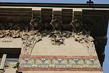 Campanini himself designed every single decorative element down to the smallest detail, with a harmonious integration of materials and shapes. He also coordinated the work of highly skilled craftsmen.[2] The façade is embellished by hammered and carved concrete plaster decorations, imitating large blocks. Every architectural element is adorned with larger than life sculpted depictions of a silkworm's life cycle - silkworms, mulberry leaves, flowers and berries, and butterflies.[2]