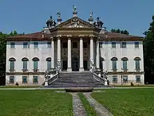 The interior is frescoed by Sebastiano Ricci and Giuseppe Angeli, who also did the frescos in Villa Widmann-Foscari.[2] The frescos were changed when Federico Giovanelli, Patriarch of Venice, took over the villa.[3] His brothers Giovanni Benedetto and Giovanni Paolo Giovannelli commissioned two large canvases by Luca Carlevarijs.[4][5] The gardens consist of labyrinths and designs.