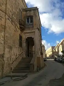 The villa is found just outside the outskirts[32] and suburb[33] of Valletta in the hamlet of Guardamangia[34] set just at the crest[35] in a quiet residential area[36] in a narrow street.[37] The villa is described as built in the form of a palace complemented with sea views over Marsamxett Harbour.[38] The Queen describes it as a "town house".[10] It is a typical traditional Maltese residence.[9] The building is built with limestone, known as sandstone and described by the Queen as "yellow stone",[10] and designed with spacious interiors.[39] The house has two entrances with one set at street level and another set after going up a flight of stairs under an elaborate front porch.[10] The royal family had taken their own personal belongings from Britain when they lived at the villa[40] allowing them to live in a lavish residence,[41] in a once-elegant home.[33] The royal family had British servants at the villa.[42]