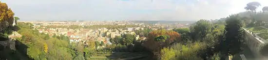 The view of the city was one of the most famous, and recorded by many artists. Giorgio Vasari made his Grand View of Rome from there, or very close by, though he slightly adjusted the slopes at the sides to expand what is actually visible from there, as did Giuseppe Vasi's Prospetto dell’alma città di Roma visto dal Monte Gianicolo, a famous large etching (1765) of the view. J. M. W. Turner did a drawing with watercolour in 1819.[7]