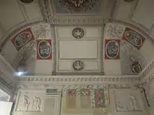 There are extensive frescos and decoration in stucco in the rooms, carried out by Raphael's workshop team under the supervision of Giulio Romano, with Polidoro da Caravaggio probably playing a leading part. These had subjects from Roman history designed to appeal to Pope Leo X, who died in 1521 before they were completed. Turini lost his job in the brief reign of Pope Adrian VI (1522–23), and they were not completed until he resumed it in 1523.[5] Other parts of the interior decoration, including the Neoclassical reliefs, date from a redecoration at the beginning of the 19th century.