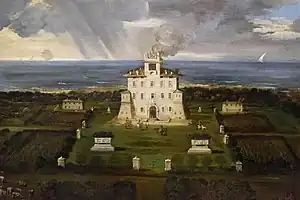The villa has a generally fortified appearance; it is block-like with corner bastions and has a belvedere terrace at the top; there were occasional attacks by pirates along the coast.[2] The plan layout, recorded in drawings by Pier Leone Ghezzi (circa 1735),[3] is simple and straightforward and lacks the formal inventiveness of Cortona's later architectural work, including the Villa Pigneto del Marchese Sacchetti.